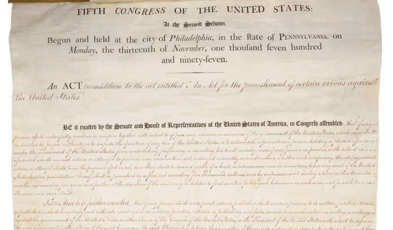 Dveji metai kalėjimo už prezidento kritiką? Taip atsitiko. Toks buvo įstatymas. Galbūt pamanėte, kad toks veiksmas būtų neįmanomas, atsižvelgiant į tai, kokie švieži buvo Pirmosios pataisos žodžiai. Tačiau valdžioje esančių žmonių impulsas susidoroti su laisvu idėjų sklaida yra būdingas valstybės valdymui.